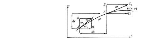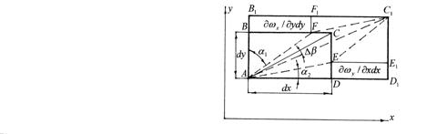 В окрестности точки на расстоянии от рассматриваемой точки прямоугольник имеет иную форму в связи с изменением модуля и наклона вектора Определим выражение для угловой скорости поворота касательной при Для этого совместим два прямоугольника точками и